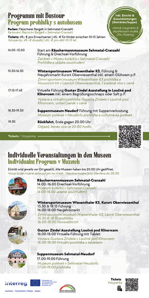 Unter dem Titel „Museumslichter Erzgebirge“ führt am 03.01.2026 dieser winterliche Ausflug am Nachmittag und Abend durch vier Museen – vom Räuchermann Museum über das Wiesenthaler K3 und die Gustav-Zindel-Ausstellung bis hin zum Suppenmuseum Neudorf.